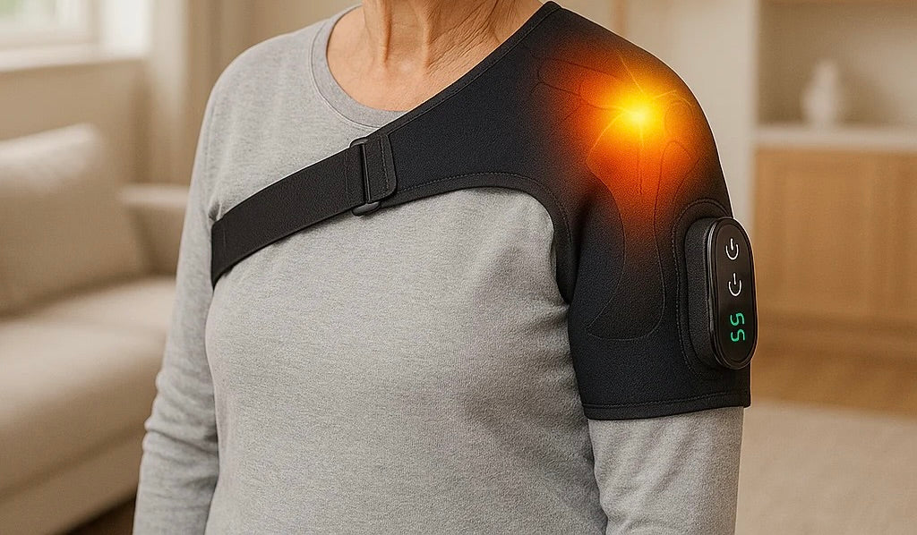 Dank des anpassbaren Designs sitzt das Gerät perfekt an der Schulter und kann sowohl während der Arbeit als auch beim Entspannen getragen werden.