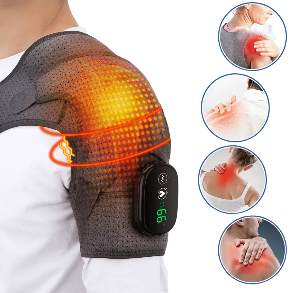 Lege das Gerät einfach um die Schulter, wähle die gewünschte Wärmestufe (40–75 °C) und Vibrationsintensität.